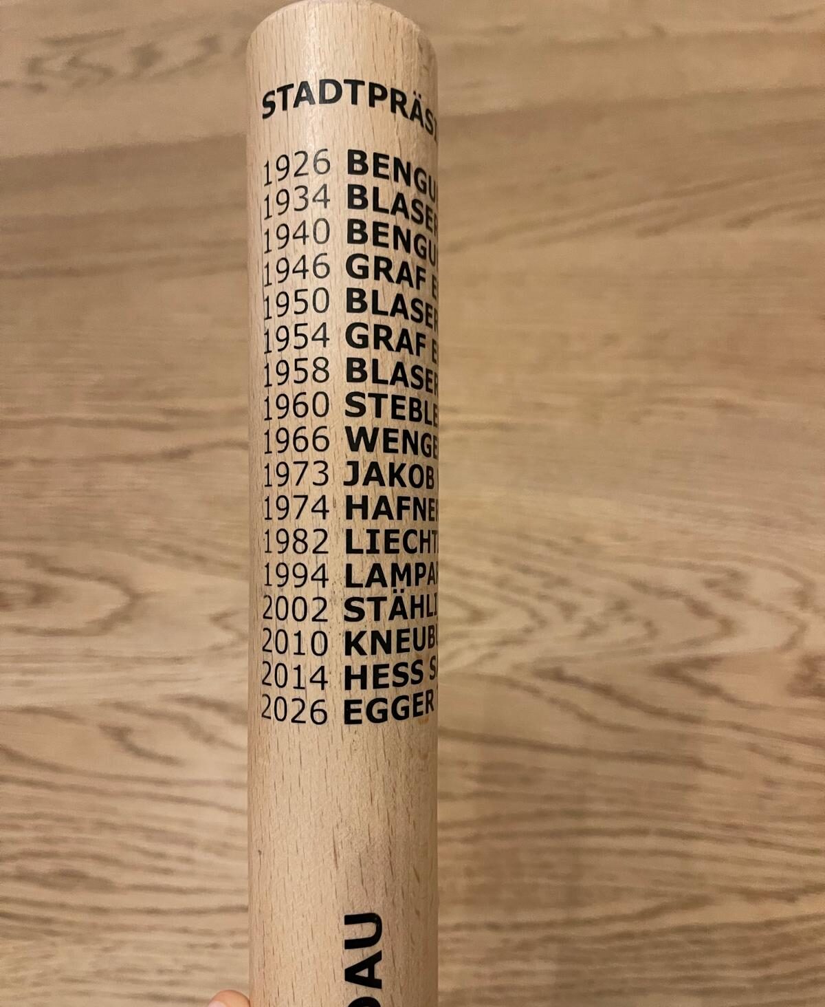 Am 20. November 2025 habe ich den speziell angefertigten Stab übergeben. Er listet die Stadtpräsidenten der letzten 100 Jahre auf.